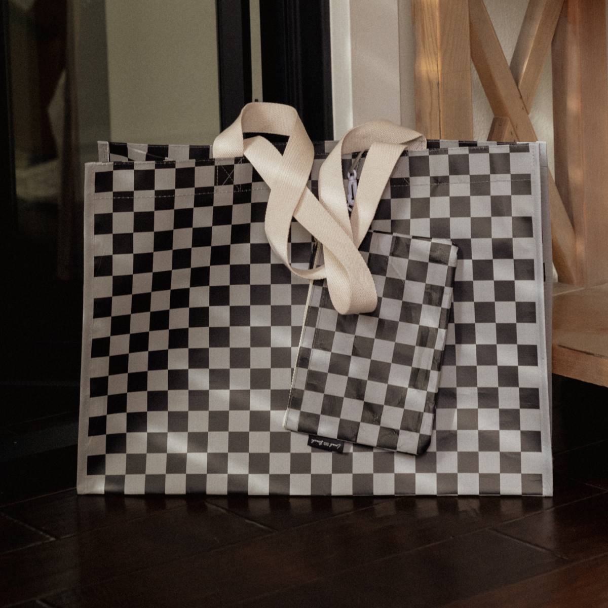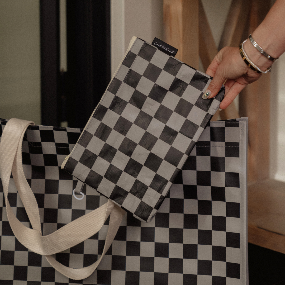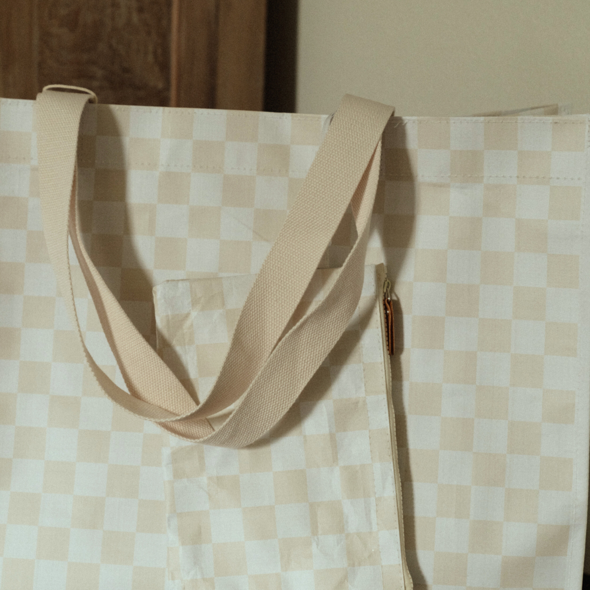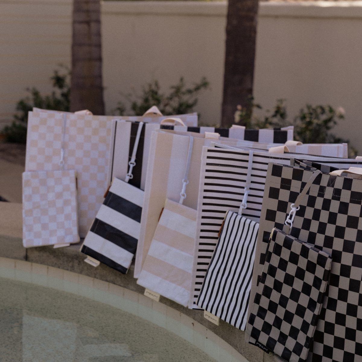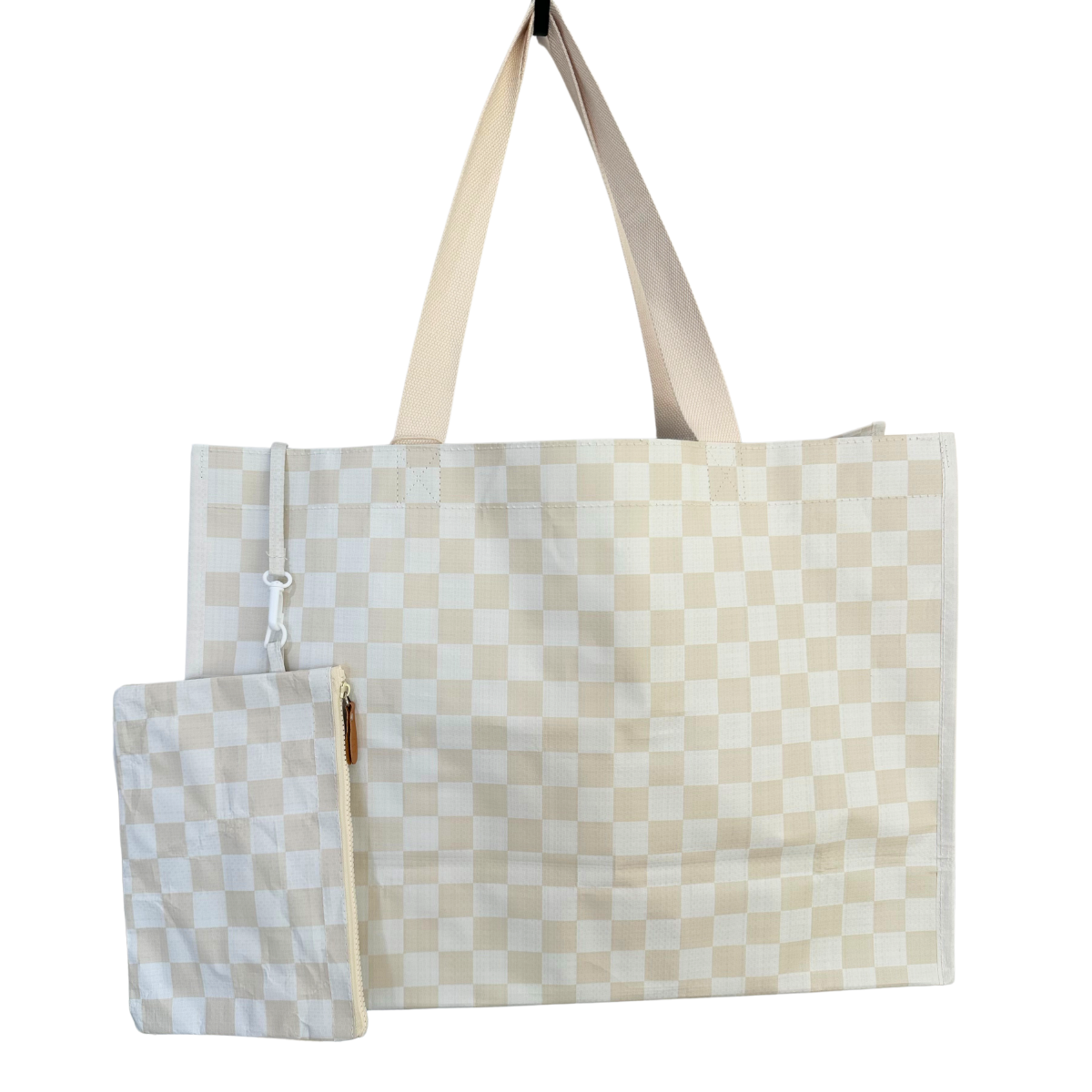 The XL All Day Bag, Shoulder Tote and Removable Pouch Set. PVC woven material with natural cotton webbing. All bags come with removable matching zip pouch. This is the perfect XL Sized all day bag with cotton web strap and drain holes in the bottom gusset. This bag fits it all. Perfect for your day trips, shopping, sunscreen, snacks, towels, beach toys, and anything else you can think of that you want to pack in one bag. Beach ready, Sand Tested, and Water resistant. Easy to clean-Just wipe it down.