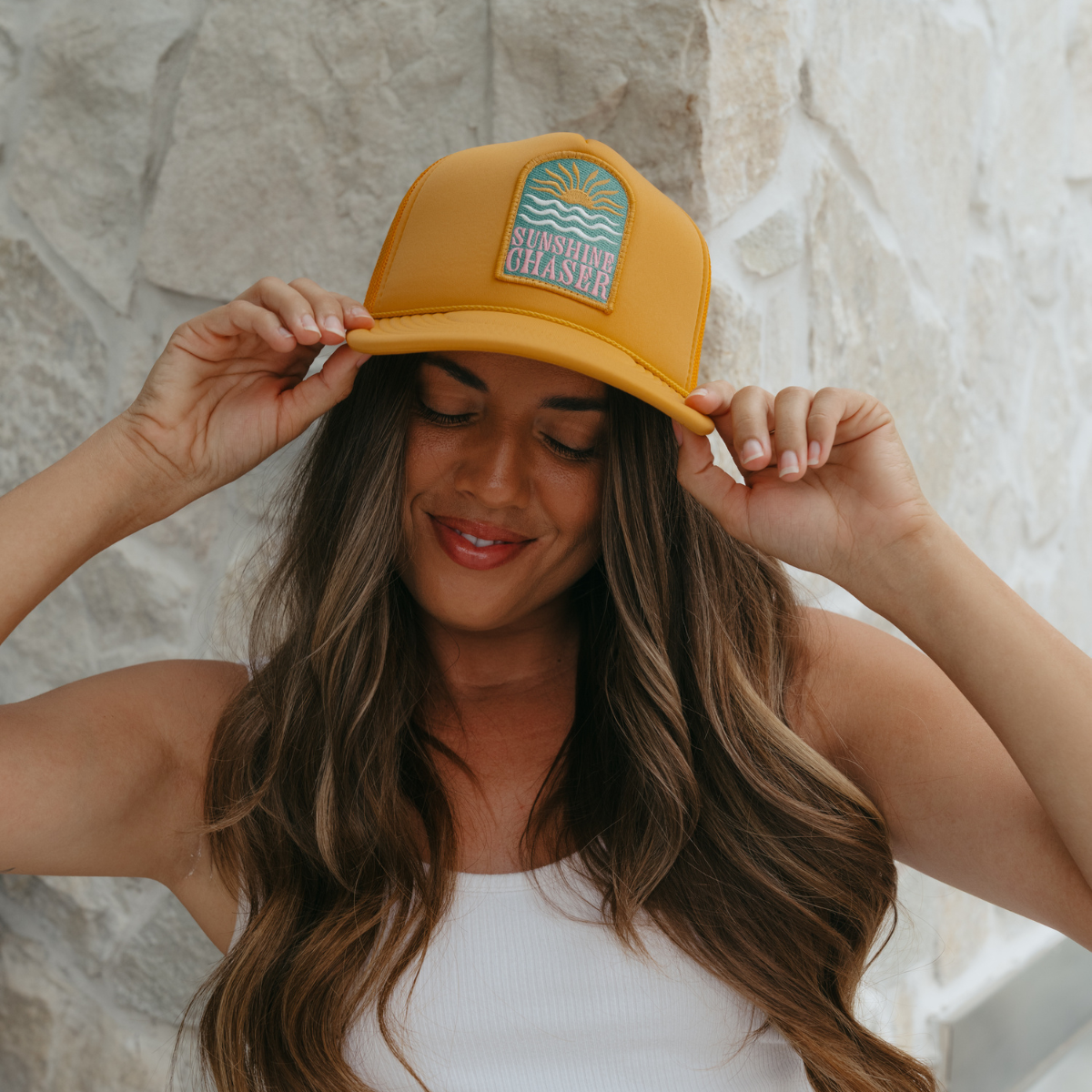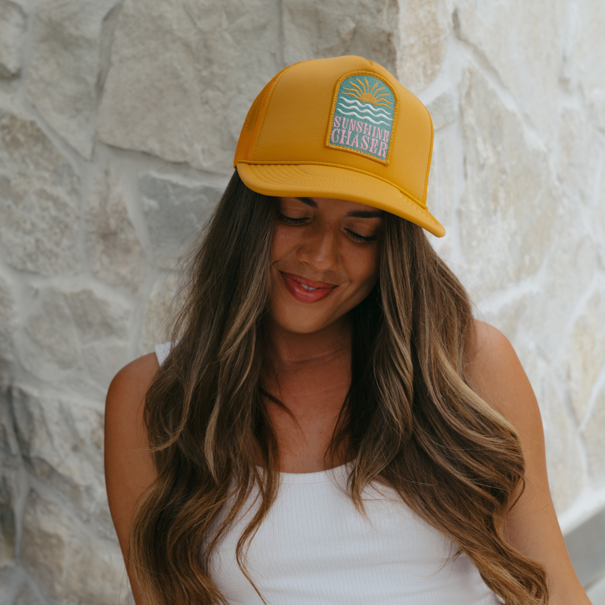 For the girl who lives for sun, salt, and surf—meet the Sunshine Chaser Trucker Hat.