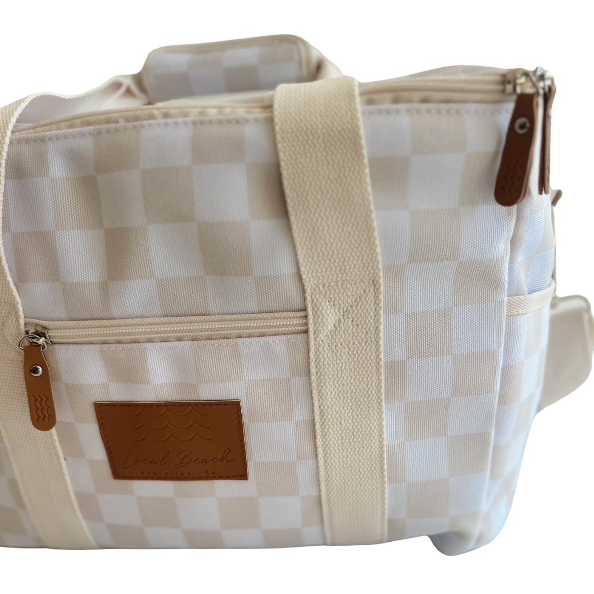 Meet your new go-to cooler for every sunny adventure. The Local Beach Checker Cooler Bag is made from durable, water resistant 100% Poly Canvas with a PVC-lined interior that stays dry and leak-free — even after 24 hours. XL in size, it holds more than a 12-pack and keeps ice from melting all day long.